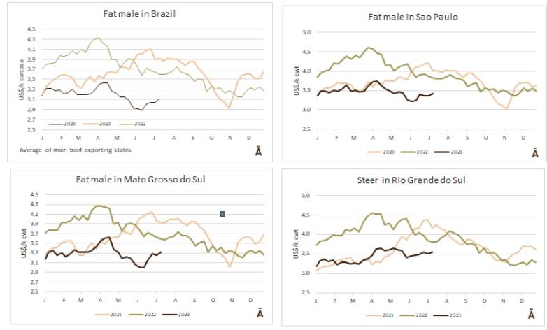 阿根廷和巴拉圭的情況正好相反。在阿根廷,公牛出口的價格并沒有抵消官方匯率的貶值,所以公牛的價格每公斤損失2美分,至每公斤3.79美元,其中包括9%的牛肉出口稅。