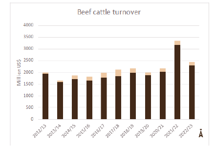 2022/2023財年,牛的最終銷售額約(包括屠宰和活牛)24.5億美元,年降幅為9億美元(-27%),當(dāng)時開具了33.4億美元的發(fā)票。銷售量和平均銷售價格下降導(dǎo)致了牛營業(yè)額的下降。