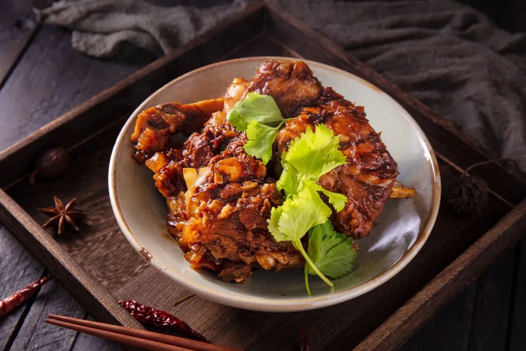 將豬背骨斬大塊,用清水清洗干凈,然后再用清水浸泡備用。將東北黃豆醬、排骨醬、蠔油混合,攪拌均勻成醬料。鍋入清水,冷水下鍋,放入浸泡過(guò)的豬背骨,加料酒去異味,大火燒開后撇浮沫,繼續(xù)燒5分鐘,將豬背骨焯透后,撈出備用。鍋入底油燒熱,下蔥、姜末爆香,放入混合醬料,炒香,放入焯好的豬背骨,翻炒均勻,再放入姜片、大蔥段、桂皮、八角、香葉、小茴香、冰糖,這是傳統(tǒng)東北醬大骨的香料,現(xiàn)在很多人都喜歡吃辣,也可加些干辣椒和青花椒,炒香后,加適量清水,加糖色、老抽,上色,撇浮沫,然后轉(zhuǎn)小火燒1個(gè)半小時(shí),如果想更加軟爛一些,可以燒2小時(shí),期間也可再次調(diào)味調(diào)色,最后轉(zhuǎn)中火,將醬汁收濃,揀出蔥、姜、香料,出鍋裝盤即成。