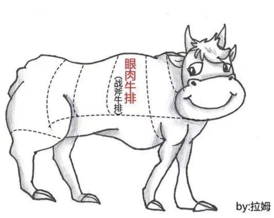 眼肉,也叫肋眼,英文是Rib Eye或Cube Roll,是整頭牛身上最經(jīng)典的牛排部位,也是判斷整頭牛雪花紋理等級的標桿部位,屬于高檔肉,是一等類肉的代表。它位于牛的肩部,牛背上兩側(cè)前面,牛脊背第七根至第十根肋骨之間,牛上腦肉與牛外脊肉之間的那塊肉。牛眼肉外形酷似眼睛,因而得名。