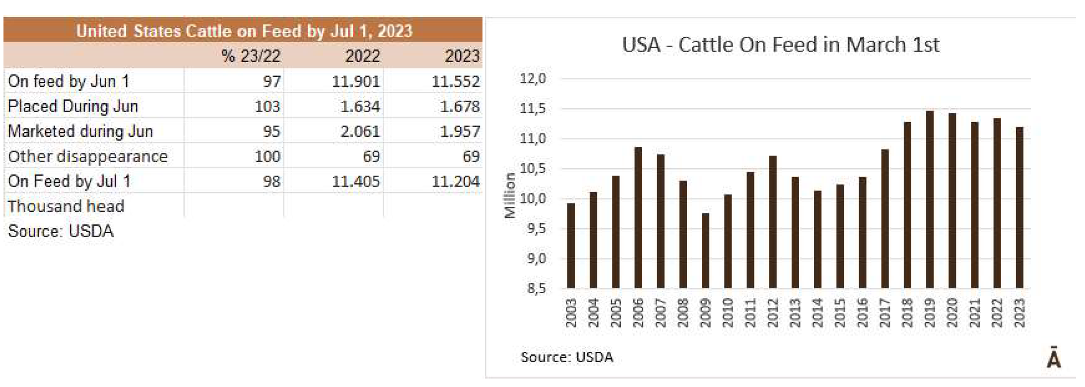 2023年7月1日,美國所有飼養(yǎng)場的牛和小??倲?shù)為1310萬頭,比前一年下降了2%。2023年7月1日,能容納1000頭和1000頭以上的飼養(yǎng)廠的牛比例占總數(shù)的85.5%,較上年略有上升。庫存包括673萬頭公牛和小牛,比前一年下降了3%,占總庫存的60%。