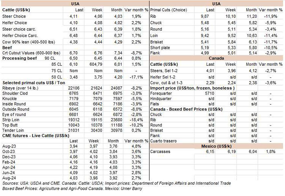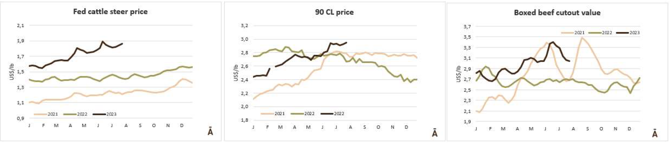 經(jīng)過前一周的下調(diào),本周巴西主要養(yǎng)牛區(qū)的屠宰牛價格保持穩(wěn)定。圣保羅州普通育肥牛平均價格是236.5雷亞爾/15公斤,出口中國市場30月齡以下的育肥牛價格高10雷亞爾/15公斤。巴西主要的牛市場價格與上周保持一致;批發(fā)市場的牛肉庫存給宰牛的價格造成了下行壓力。8月初,隨著父親節(jié)需求的增加,價格預(yù)計會上漲。
