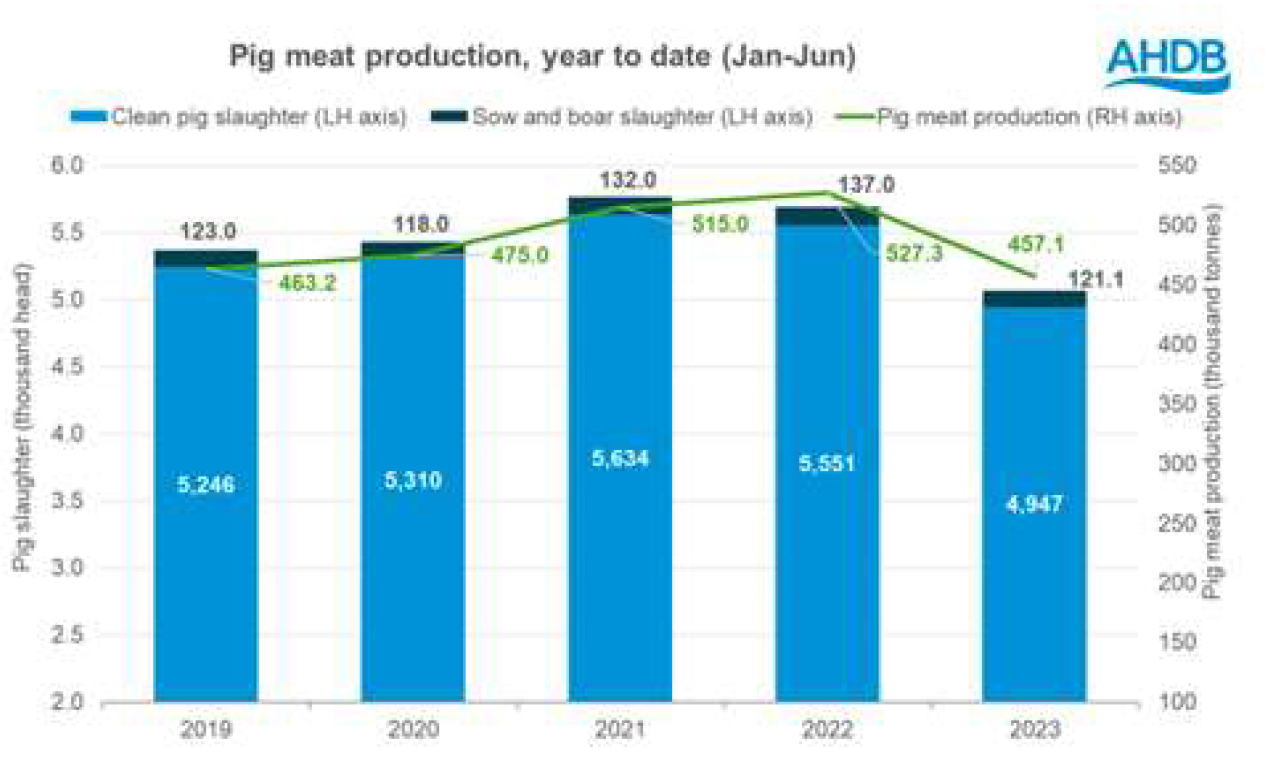 由于產(chǎn)量大幅下降,英國豬肉市場繼續(xù)保持非常緊張的供應(yīng)。這意味著生豬價格保持不變,但生豬屠宰場的屠宰量變少。6月份,豬肉產(chǎn)量達到74700噸。與2022年5月相比,產(chǎn)量下降了7%,與6月相比產(chǎn)量下降了11%。屠宰量達到813700頭,比5月份減少6%,比2022年減少11%。六月份胴體的重量也有所下降,為88.3公斤。今年迄今(1月至6月),英國豬肉總產(chǎn)量達到45.71萬噸,比去年上半年的產(chǎn)量低13%,是2017年以來的最低產(chǎn)量。這主要是由于屠宰量較低,今年前六個月屠宰495萬頭。這比去年下降了11%,也是自2013年以來的最低數(shù)字。
