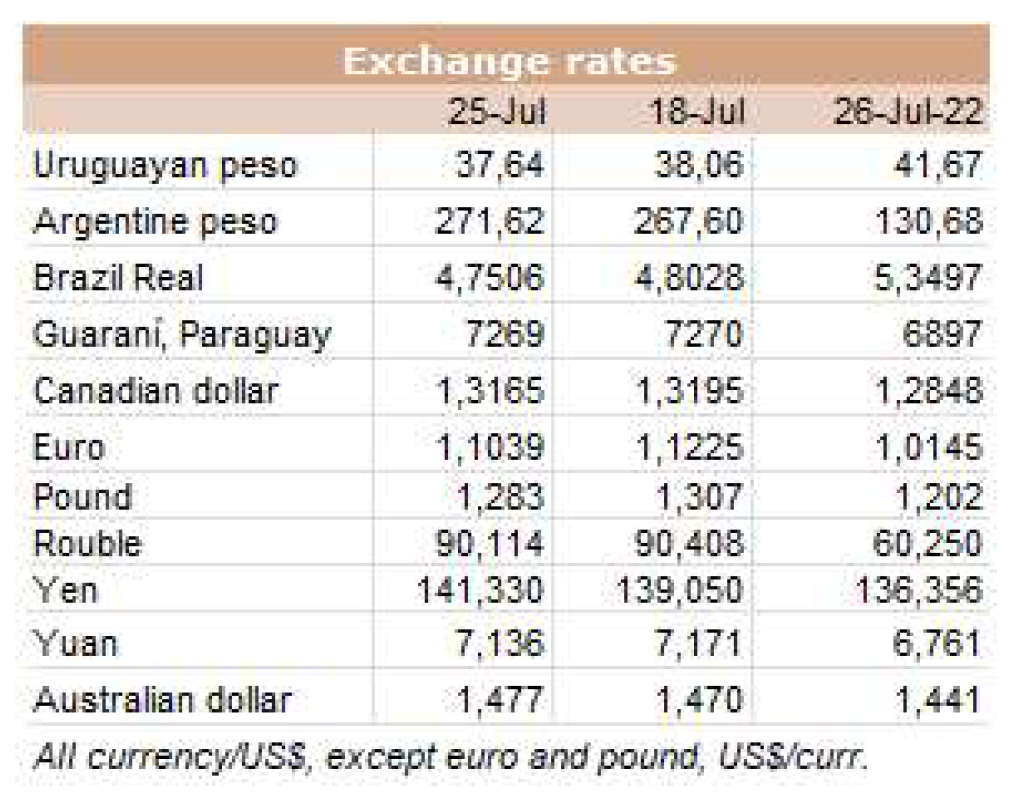 一位貿(mào)易商稱,智利進口市場保持著控制“邊境開放的情況下貨物的具體到貨量”的節(jié)奏。 他補充道,烏拉圭和巴西的19-20分體價格是CIF 5400-5600。消息人士評論道:“智利人正在等待市場吸收即將到來的東西,以便在國慶節(jié)期間外出購買,今年的國慶節(jié)會有點復(fù)雜。”。