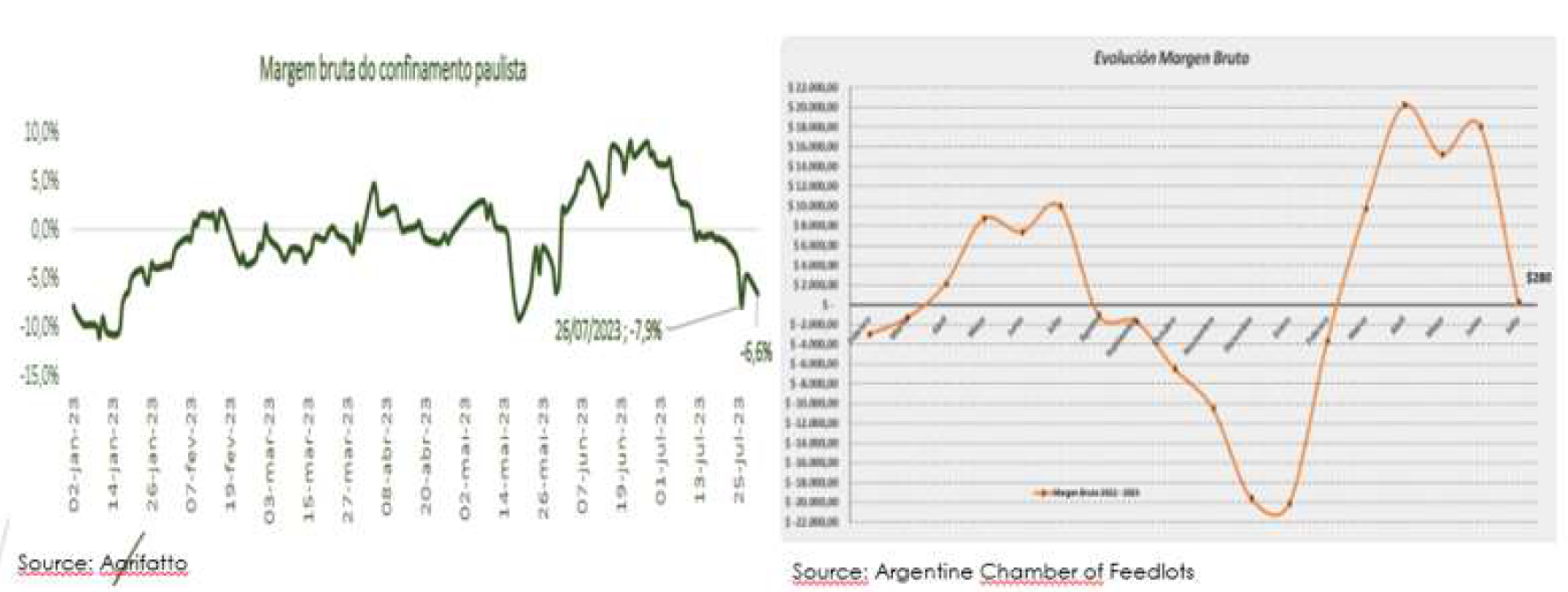一位分析師稱,適合出口到中國的??赡軙?huì)減少,但無論如何,供應(yīng)都不會(huì)減少,飼養(yǎng)場的牛數(shù)量將達(dá)到700萬頭。在圣保羅,飼養(yǎng)場7月份的數(shù)字為負(fù)數(shù),26日達(dá)到7.9%。盡管玉米價(jià)格明顯下降,牛的價(jià)格保持相對較低,被送往屠宰場牛的價(jià)格下跌使數(shù)字變紅。阿格里法托說:“隨著10月23日育肥牛的價(jià)格將降至249雷亞爾/15公斤以下,超過了過去60天16%的成本下降,飼養(yǎng)場毛利率顯示負(fù)數(shù)。因此,預(yù)計(jì)10月和11月屠宰的動(dòng)物數(shù)量會(huì)減少是合理的。