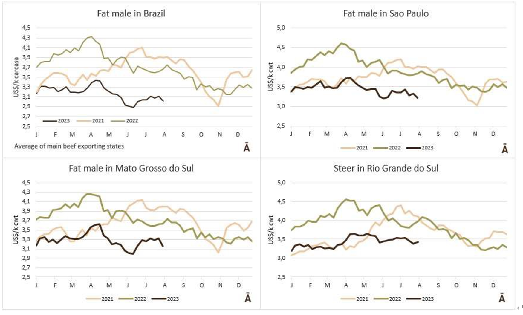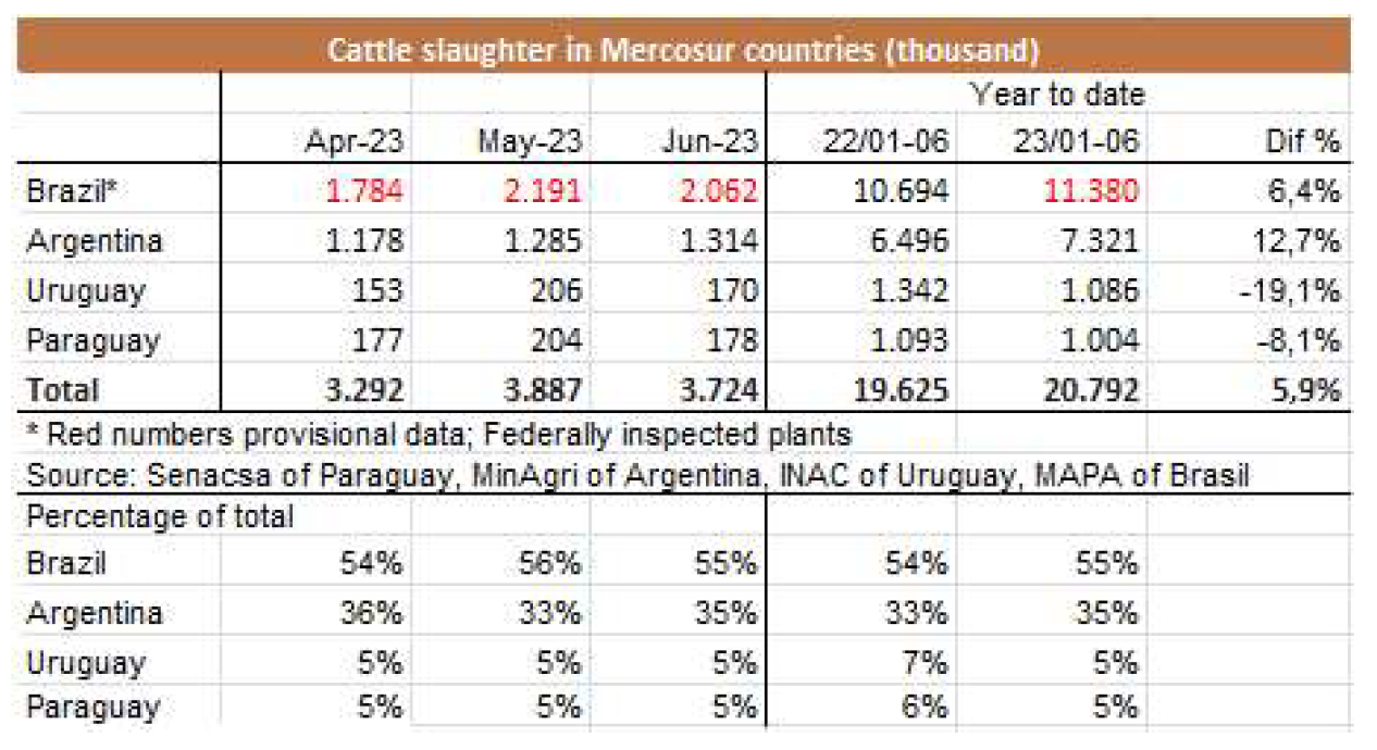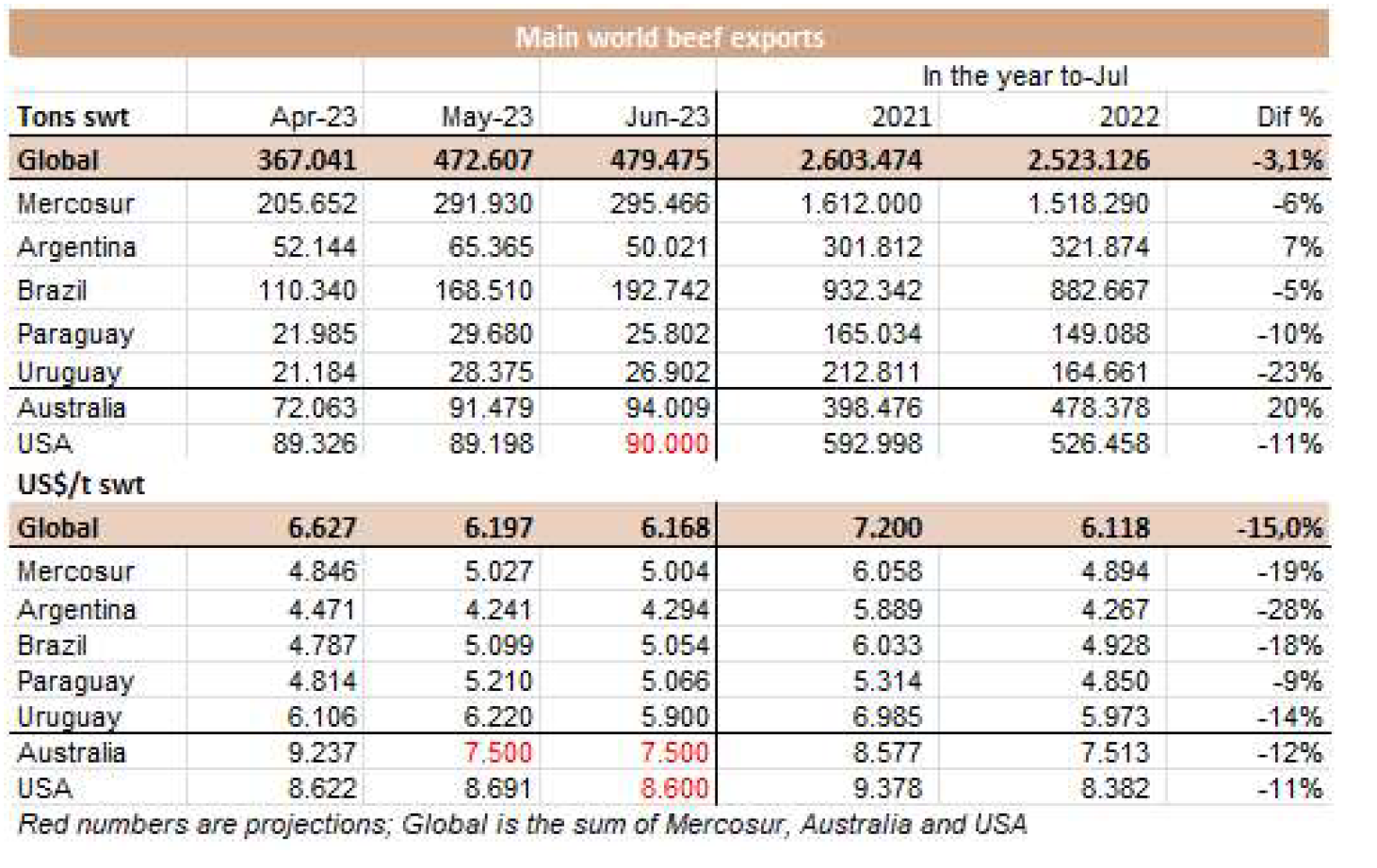 根據(jù)外貿(mào)部(SECEX)的信息,巴西7月份出口了160795噸牛肉,平均價(jià)值為4740美元/噸。與6月份相比,產(chǎn)量減少了近3.2萬噸,但同比僅減少了6.5萬噸。平均出口價(jià)格在月度比較中下降6.2%,在年度比較中下降27.6%。因此,與去年同月相比,巴西的出口量在5月和6月出現(xiàn)了復(fù)蘇。今年至7月份,巴西出口了104萬噸牛肉,比2022年同期減少了5.6萬噸(-5.1%);與每噸4899美元相比,平均出口價(jià)格下降了20%。