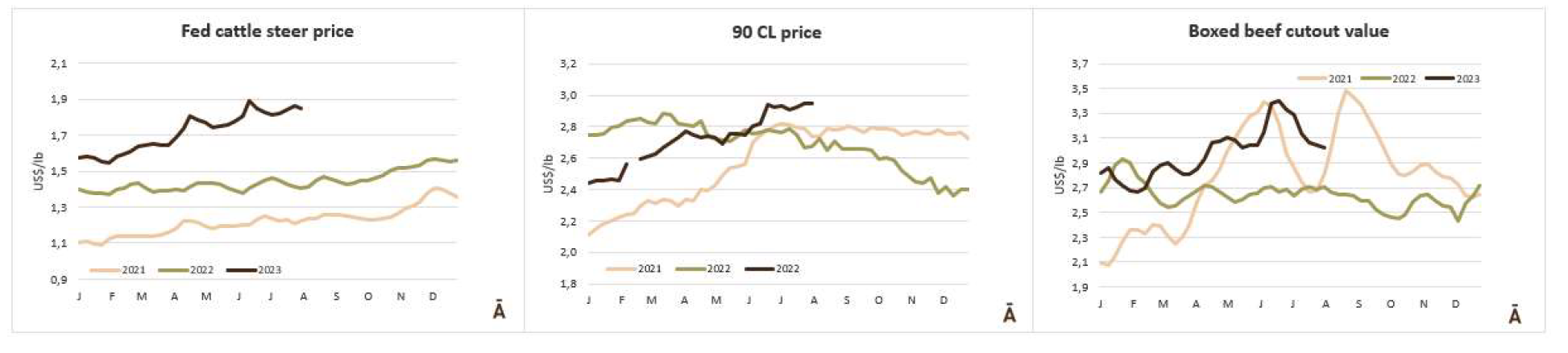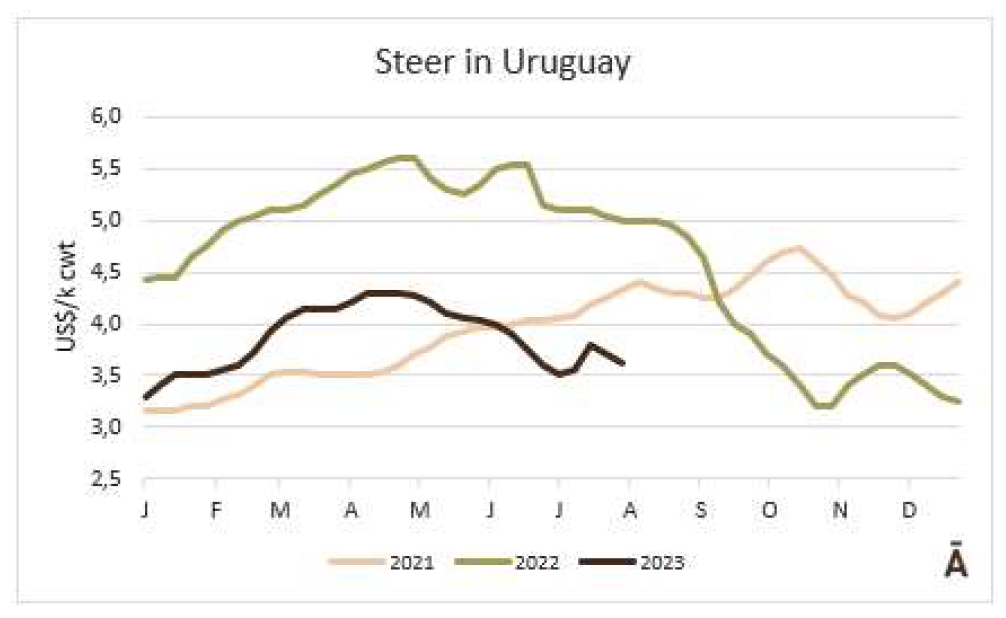 烏拉圭7月份出口了26038噸牛肉,和六月份的數(shù)據(jù)相似,比2022年7月增加了約1500噸。這是今年出口同比增長的第一個(gè)月,平均出口價(jià)格為每噸5534美元,比上月下降了240美元(-4.2%),是今年迄今為止的最低月度平均值。
