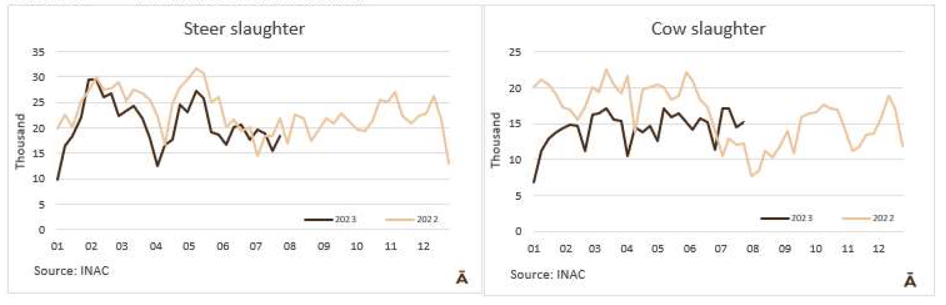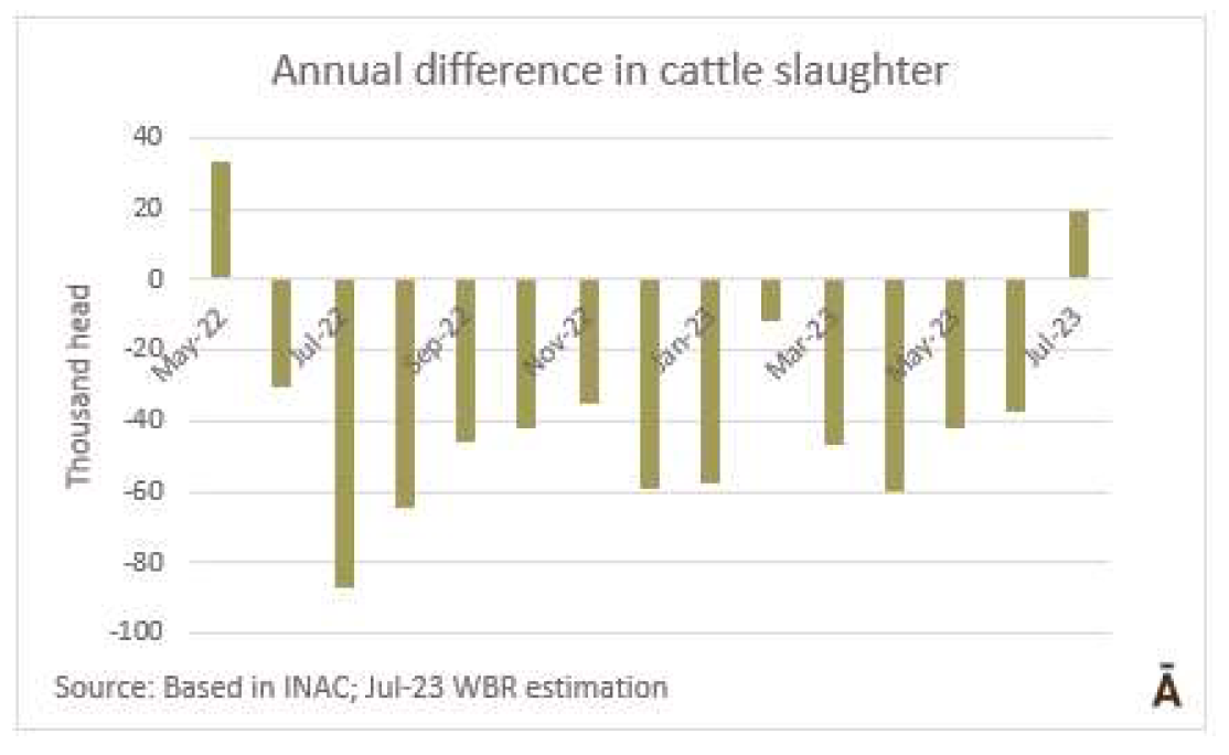 根據(jù)SENASA臨時(shí)數(shù)據(jù),7月份的屠宰許可包括129萬頭牛,比前一個(gè)月減少了1%,但是比一年前增加了14%。年度增幅最大的品種是小母牛(26%),其次是奶牛(19%)和幼牛(16%),對公牛的屠宰沒有改變。與5月和6月的比例一致,7月母牛屠宰比例為48.7%,比去年同月增加了三個(gè)百分點(diǎn)。
