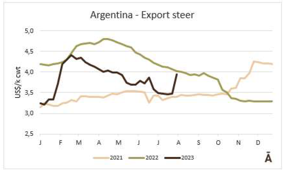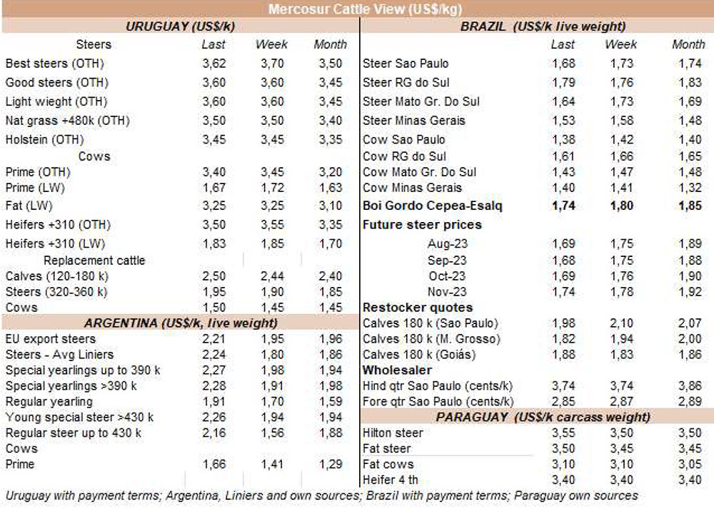 阿根廷出口公牛的價(jià)格本周爆炸式增長了50美分至每公斤酮體4.30美元(包括9%的出口稅)。而巴西恰恰相反,那里的包裝公司被收購以此壓低價(jià)格。出口州的平均每公斤損失9美分至每公斤3.02美元,成為該地區(qū)的最低價(jià)格參考值。烏拉圭的牛的價(jià)格也面臨下行壓力,主要是質(zhì)量最重、最好的公牛,價(jià)格為3.60美元左右。在巴拉圭,良好的飼料條件要求牛肉維持3.50美元左右的市場價(jià)格。