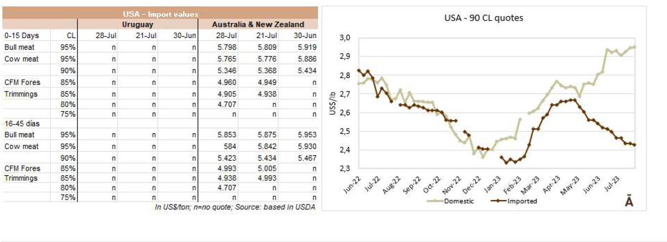 一位貿(mào)易商表示,在大洋洲(新西蘭和澳大利亞)大量牛肉供應(yīng)占主導(dǎo)地位的情況下,美國進(jìn)口市場并沒有表現(xiàn)出很大的變化。烏拉圭配額內(nèi)牛前部位肉90CL的參考價(jià)格為FOB 4550美元每噸。