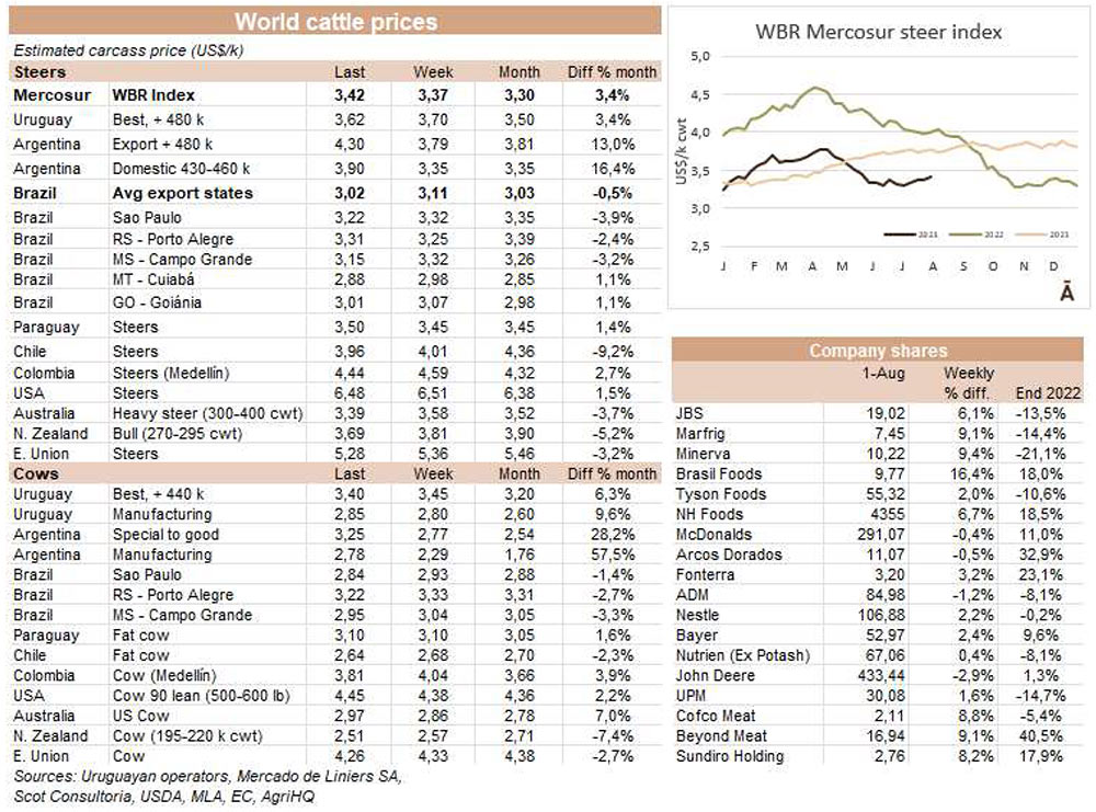 上周末,阿根廷農(nóng)場到屠宰場的價(jià)格大幅上漲,并推高了地區(qū)平均值,盡管巴西本周呈下跌趨勢。WBR南方共同市場公牛指數(shù)上漲5美分至每公斤酮體3.42美元,為10周來的最高值。