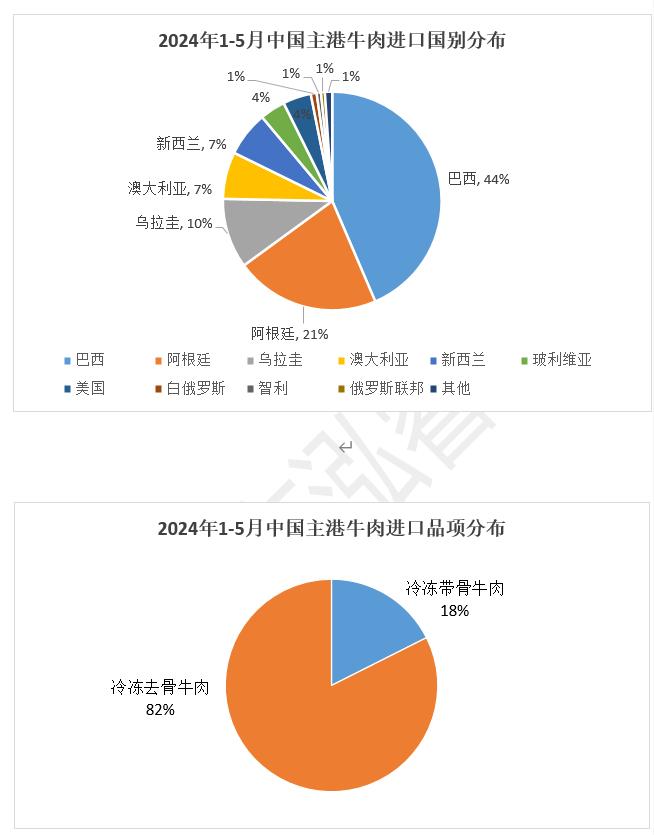 從進(jìn)口品項(xiàng)看,冷凍帶骨牛肉1-5月平均單價(jià)2684美元/噸,進(jìn)口來(lái)源主要分布在烏拉圭、阿根廷、新西蘭和澳大利亞。冷凍去骨牛肉1-5月進(jìn)口平均單價(jià)5150美元/噸,進(jìn)口來(lái)源主要分布在巴西、阿根廷、澳大利亞、烏拉圭和美國(guó)。