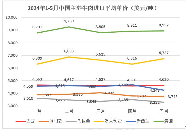 從進(jìn)口單價(jià)看,巴西1-5月平均單價(jià)為4627美元/噸,去年同期為5232美元/噸,阿根廷1-5月平均單價(jià)為3879美元/噸,去年同期為4215美元/噸,烏拉圭1-5月平均單價(jià)為3460美元/噸,去年同期為4120美元/噸,美國(guó)1-5月平均單價(jià)為8927美元/噸,去年同期為8421元/噸。各國(guó)進(jìn)口平均單價(jià)為4633美元/噸,去年同期為5188美元/噸??傮w來(lái)看,牛肉進(jìn)口單價(jià)同比均呈下降趨勢(shì)。