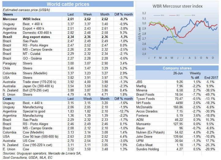 育肥牛價(jià)格走勢(shì)不均衡,阿根廷牛價(jià)大漲,但被巴西和巴拉圭降價(jià)所抵消,閹牛指數(shù)本周降低1美分至2.61美金/公斤,兩年來(lái)新低。阿根廷本地牛價(jià)上漲,再加上比索增值1.8%,出口閹牛美金價(jià)增加了8美分至2.51美金,但是巴西由于雷亞爾貶值1%價(jià)格下降2美分至2.34美金,巴拉圭低溫使育肥牛供應(yīng)增加,價(jià)格也下跌,烏拉圭牛價(jià)和上周持平。