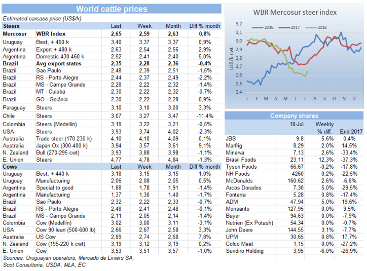本周南方共同市場閹牛價格復蘇,主要原因除了各國貨幣增值,還包括活牛市場的穩(wěn)定,本周從2.59美金/公斤漲到2.65。本周巴西雷亞爾增值2.7%,阿根廷比索增值3.3%,此外巴西平均牛價增長了0.5%到134.1雷亞爾,因此巴西育肥牛價格漲了7美分到2.35美金,阿根廷本地牛價保持穩(wěn)定,但貨幣增值導致美金價漲了9美分至2.63美金。烏拉圭牧場的活牛供應非常短缺,由于481配額的原因需求也在增加,所以價格呈上漲趨勢,巴拉圭活牛價格本周沒有變化。