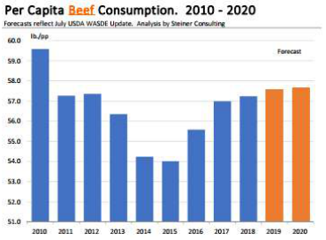 USDA在六月存欄報告出來之后對供應/需求平衡表做了微調,2019年預測牛肉產(chǎn)量調低了7500萬磅,主要原因是平均胴體重量比預期低,并且第三季度屠宰量也有下行的趨勢。產(chǎn)量的減少會被需求端的調整抵消一部分,進口量將增加1000萬磅,出口量會減少1000萬磅,此外人均牛肉消費量也被調低,僅會同比增長0.6%。不過USDA對2020年的預測數(shù)據(jù)并沒有進行調整,而且雖然牛肉供應量將減少,USDA還是把2019年閹牛價格預測調低了1.3%。