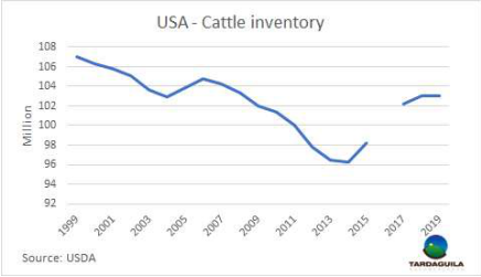 7月1日所有活牛和牛犢存欄量1.03億頭,和去年同期相同,年中牛犢存欄3630萬(wàn)頭,上半年共出生2650萬(wàn)頭小牛犢,下半年預(yù)計(jì)會(huì)出生980萬(wàn)頭小牛犢。所有母牛和小母牛存欄4170萬(wàn)頭,其中肉母牛3240萬(wàn)頭,母奶牛930萬(wàn)頭。
