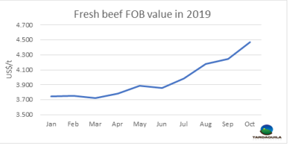 中國市場的更好機會使冷凍牛肉到歐洲市場出口量減少至本世紀初口蹄疫危機后最低水平。根據(jù)海關(guān)出口數(shù)據(jù),10月冷凍牛肉到歐洲出口量僅323噸,今年截至10月,出口量總計7796噸,比2018年同期減少44%。另一方面,冷鮮牛肉出口至歐洲共1044噸,因為上個月481配額范圍內(nèi)的發(fā)貨量幾乎為零。今年截至目前冷凍牛肉和冷鮮牛肉出口至歐洲量減少21%,減少至2.8萬噸。