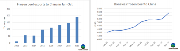 10月烏拉圭共出口冷凍牛肉24165噸,其中出口中國19941噸,約占總出口量的82.5%。上個月烏拉圭出口鮮牛肉26357噸,比九月出口量28882噸有所下降。出口量的減少由于季節(jié)性減產(chǎn)。中國擁有比其他出口目的地更高的價格,因此中國市場份額越來越高并不意外。10月中國冷凍牛肉采購價格平均5549美元/公斤,比1月采購價格上漲25%。今年前10個月,14.7萬噸冷凍去骨牛肉和4.6萬噸帶骨牛肉出口至中國去骨產(chǎn)品和帶骨產(chǎn)品出口量分別同比增長35%和16%。