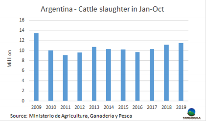 10月阿根廷牛只屠宰量超過130萬,創(chuàng)2009年以來屠宰量最高紀錄,2009年在基什內(nèi)爾政府實施了三年的反出口政策之后,這一年發(fā)生了嚴重的母牛存欄缺失,嚴重的干旱更加劇了這種效應(yīng),導(dǎo)致約20%的存欄流失。與當時不同的是,今年養(yǎng)牛者不會因此而決定退出不錯,而是決定利用中國牛肉價格極好的有利條件,在總體形勢不太好同時又缺乏以可承受的信貸利率的情況下。雖然現(xiàn)在沒有看到母牛的存欄的缺失,但一些人對此表示擔憂,并對此進程持謹慎態(tài)度。當中國新年的推動力逐漸消失時會發(fā)生什么我們將拭目以待。