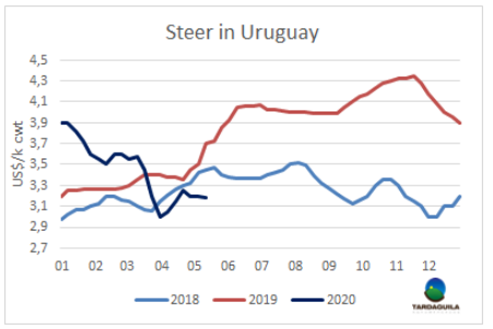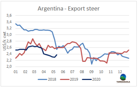 2020年開端南美國(guó)家屠宰量下降,但這并不意味著出口量減少。相反,受新冠肺炎疫情影響,相對(duì)于國(guó)內(nèi)市場(chǎng)的疲軟,出口活動(dòng)獲得了有競(jìng)爭(zhēng)力的收益,出口量保持堅(jiān)挺。今年前四個(gè)月,南方共同市場(chǎng)牛只屠宰量約1270萬(wàn)頭,較2019年同期減少90萬(wàn)頭,減少6.6%。烏拉圭牛屠宰量減少最嚴(yán)重,減少了23.1萬(wàn)頭,約28%。屠宰量占比最大的是巴西,巴西經(jīng)過(guò)認(rèn)證的肉類工廠牛只屠宰量706萬(wàn)頭,較2019年同期減少95.5萬(wàn)頭,約12%。阿根廷和巴拉圭屠宰量增長(zhǎng)部分抵消屠宰量的下降。在為遏制新冠病毒擴(kuò)散采取的措施給給國(guó)際貿(mào)易帶來(lái)了極大的復(fù)雜性的情況下,產(chǎn)量的下降并沒(méi)有阻止出口保持堅(jiān)挺。1-4月,南方共同市場(chǎng)牛肉出口量79萬(wàn)噸,高出2019年同期出口量(77萬(wàn)噸)。出口相對(duì)國(guó)內(nèi)市場(chǎng)在盈利方面的強(qiáng)競(jìng)爭(zhēng)力成為巴西出口趨勢(shì)得以保持的主要原因。巴西肉類加工廠以雷亞爾買牛,那些做國(guó)內(nèi)市場(chǎng)的以雷亞爾賣牛肉,以滿足巴西國(guó)內(nèi)消費(fèi)者的需求。相反,出口工廠以美元賣牛肉,美元的價(jià)值一天比一天高。自年初以來(lái),巴西貨幣的貶值幅度一直在40%上下波動(dòng)。因此,盡管牛肉產(chǎn)量下降,巴西出口商海外銷售發(fā)運(yùn)量46.7萬(wàn)噸,較2019年1-4月增長(zhǎng)5%。阿根廷情況一樣,盡管出口商必須以官方匯率(較平行市場(chǎng)低很多)將收到的美元兌換成比索,并且付9%的出口稅,阿根廷1-4月出口量小幅增長(zhǎng),上漲了10%,阿根廷1-4月屠宰量上漲了6%。烏拉圭情況類似,今年截至目前,出口量的降幅小于屠宰量的降幅,分別為(20%和28%),屠宰量的減少被進(jìn)口量的增長(zhǎng)抵消。巴拉圭出口量和屠宰量的漲幅相當(dāng),3%-4%。總之,南美地區(qū)作為世界最大的牛肉供應(yīng)地區(qū),保持堅(jiān)挺的銷量,盡管新冠肺炎疫情給需求端帶來(lái)困境,動(dòng)物蛋白需求旺盛,尤其是亞洲大陸,更精確說(shuō)是中國(guó)。