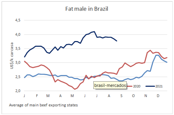 南方共同市場閹牛價格指數(shù)連續(xù)第二周上漲,本周下降了3美分至3.83美元/公斤。巴西牛價疲軟下跌,烏拉圭牛價穩(wěn)定,阿根廷和巴拉圭牛價穩(wěn)中有漲。