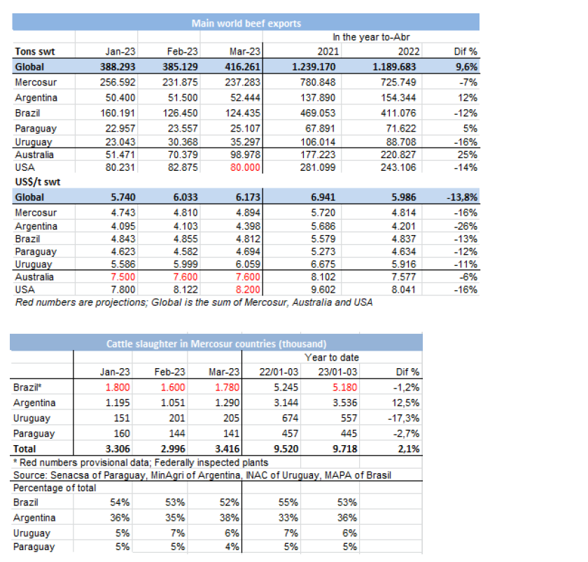 2023年前三個(gè)月,牛肉出口量達(dá)到15.6萬(wàn)噸,出口額為6.542億$,與上年同期相比增長(zhǎng)13.2%,出口額下降16.4%。本季度的出口量相當(dāng)于22.18萬(wàn)噸帶骨牛肉。