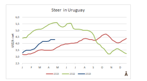 在烏拉圭出口閹牛報(bào)價(jià)為繼續(xù)穩(wěn)定在4.30$/kg cwt。
