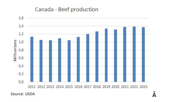 美國(guó)農(nóng)業(yè)部預(yù)計(jì)2023年加拿大牛肉產(chǎn)量為137.5萬(wàn)噸,比2022年減少2萬(wàn)噸。