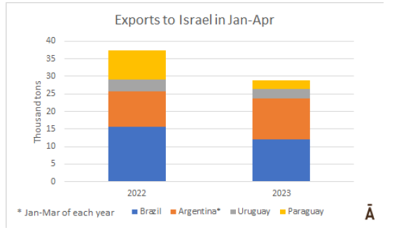 今年頭幾個(gè)月,南方共同市場(chǎng)國(guó)家對(duì)以色列的牛肉出口縮減了24%。考慮到1月-4月間巴西、烏拉圭和巴拉圭的出口量,加上第一季度阿根廷的出口量,今年的出貨量為28,512噸,比2022年同期的37,452噸少了近9,000噸。