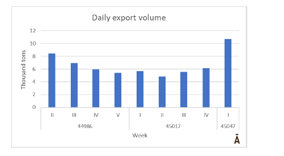 3月所有四個(gè)主要市場(chǎng)(日本、韓國(guó)、美國(guó)和中國(guó))的出口量都很相似,4月份中國(guó)成為最大的客戶,出口了16,745噸。
