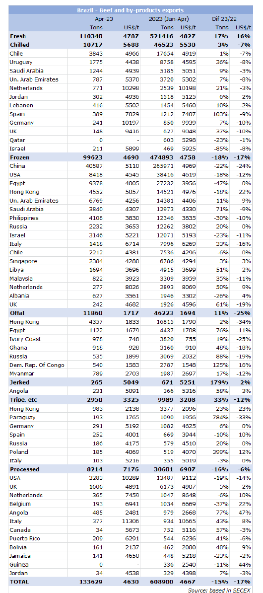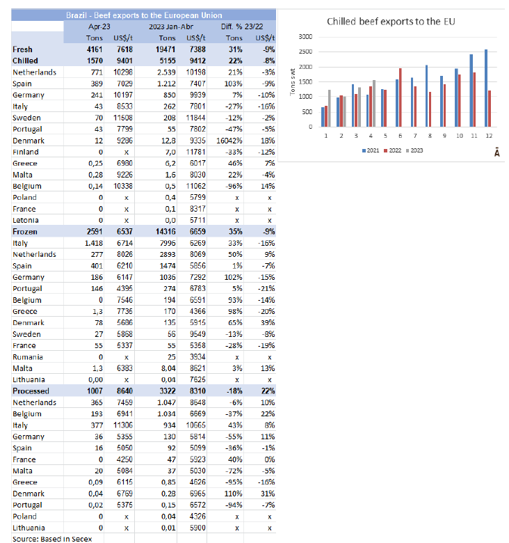 1月至4月期間,巴西向歐盟國(guó)家出口了19,471噸冰鮮牛肉,比2022年同期增長(zhǎng)31%。增長(zhǎng)的主要是冰鮮肉(增長(zhǎng)22%至5,155噸)和冷凍肉(增長(zhǎng)35%至14,316噸)。