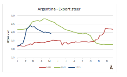 在阿根廷,以阿根廷比索計(jì)算的出口指導(dǎo)價(jià)保持了上周的價(jià)格,下跌7美分,至每公斤4.28美元。