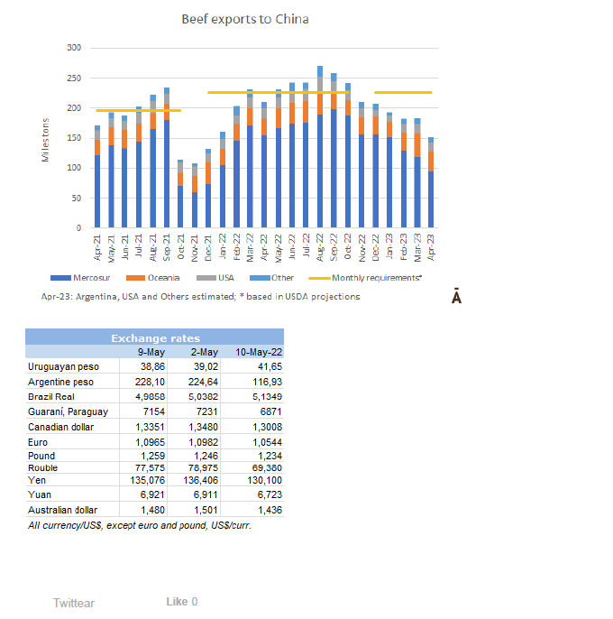 由于存欄量仍很大,一些貨物的到達(dá)時(shí)間被推遲到6月初。進(jìn)口商解釋說(shuō),由于利率上升,以及美元在以色列的上漲,商業(yè)運(yùn)作正變得艱難。除此之外,由于以色列政府采取措施的危機(jī)情況,肉類消費(fèi)下降,全國(guó)有一半的人已經(jīng)參加了三個(gè)多月的大型示威活動(dòng)。所有這些都導(dǎo)致了銷(xiāo)售和消費(fèi)的減少。