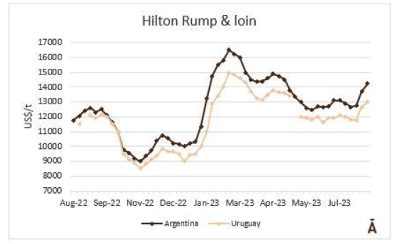 上周,希爾頓配額范圍內(nèi)的冰鮮市場再次走強,阿根廷的臀腰肉價格在FOB 14000-14500美元之間。一位歐洲貿(mào)易商評論道:“目前,歐洲沒有足夠的產(chǎn)品,這也有助于價格上漲。此外,市場上的肉類數(shù)量有限,因此需求狀況良好?!?span>