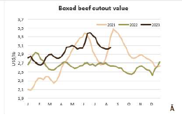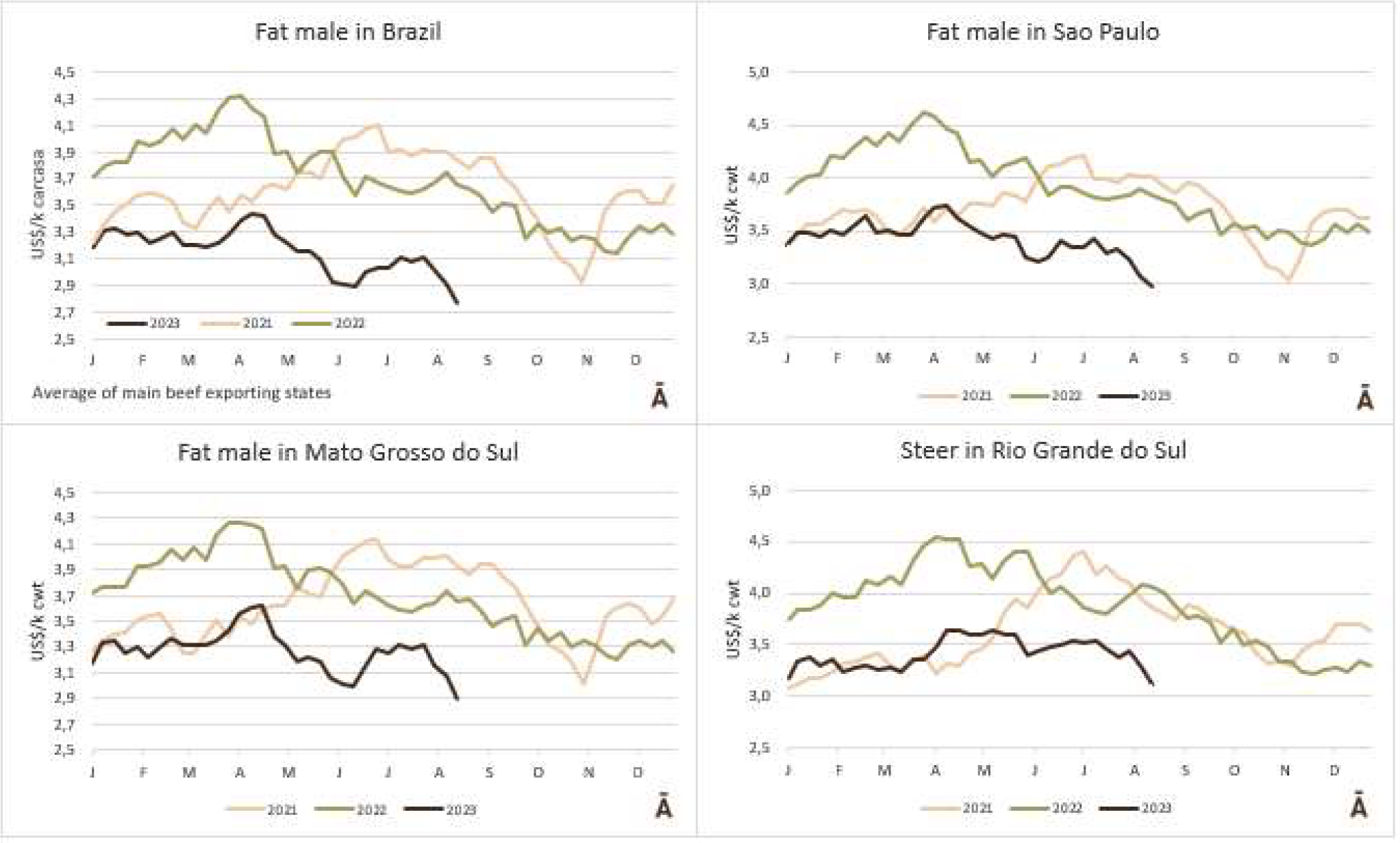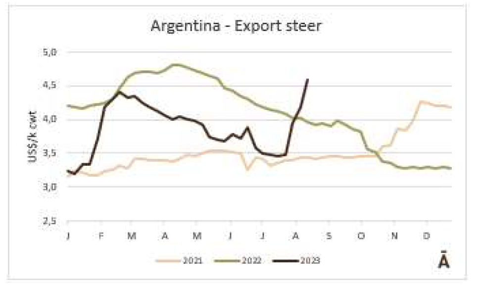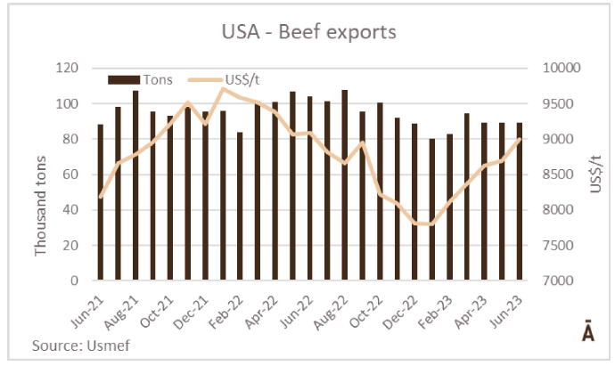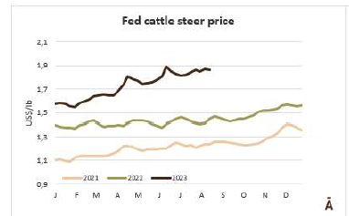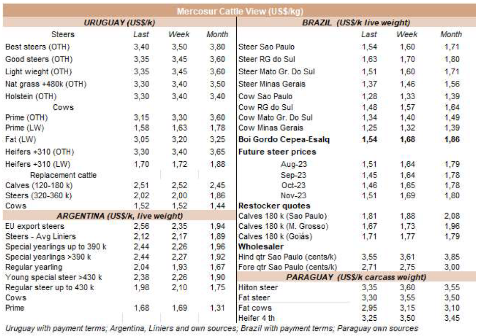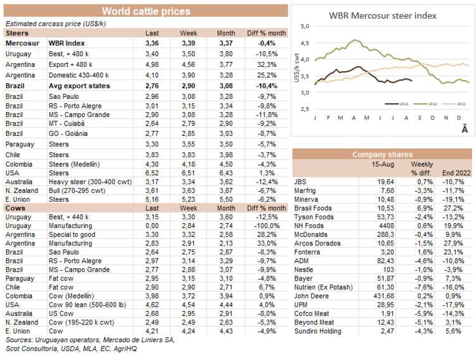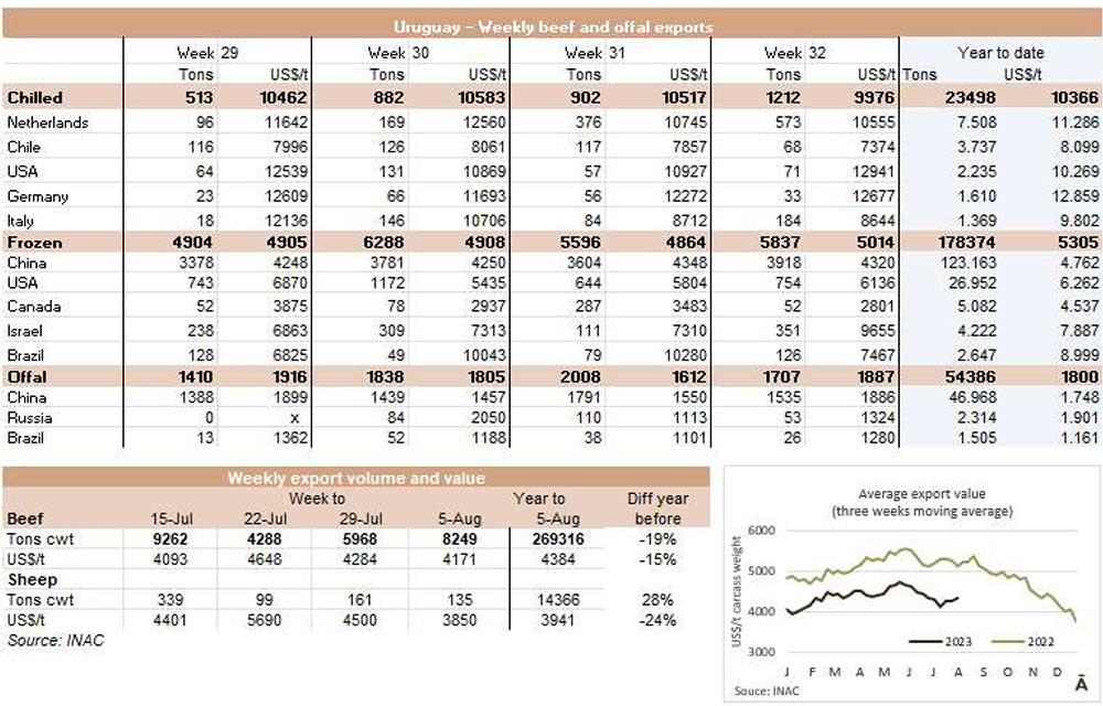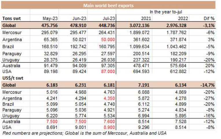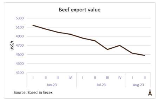 根據(jù)外貿(mào)部的數(shù)據(jù),8月第二周,巴西以每噸4482的平均價格出口了42077噸牛肉。平均價格為4500美元/噸,比6月第一周的平均價格每噸低600美元(-13%)。在8月的前9個工作日,巴西以每噸4507的平均價格出口了83344噸牛肉。預(yù)計月底的產(chǎn)量將略低于20萬噸,這意味著與2022年8月的20.3萬噸相比將略有下降。