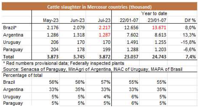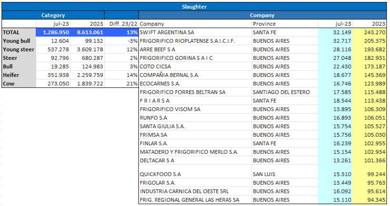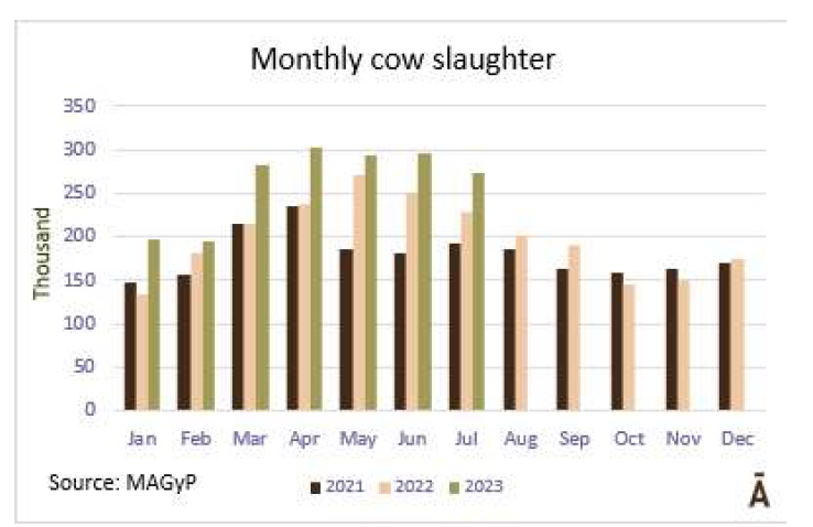 7月份,共屠宰129萬頭牛,比上月減少2%,比去年同月增加16%.根據(jù)官方數(shù)據(jù)。在今年的前7個月,861萬頭牛被屠宰,年增長率為13%,這是自2009年大清算以來的最大增幅,該清算使該國的牛存欄減少了20%。與2022年相比,2023年的增長尤其體現(xiàn)在屠宰量增長了21%,然后是小母牛增長了14%,其次是幼牛,年增長了12%。7月份,母牛屠宰量占總數(shù)的48.5%以上。今年到目前為止,這一比例約為47.5%,而2022年同期為46%。