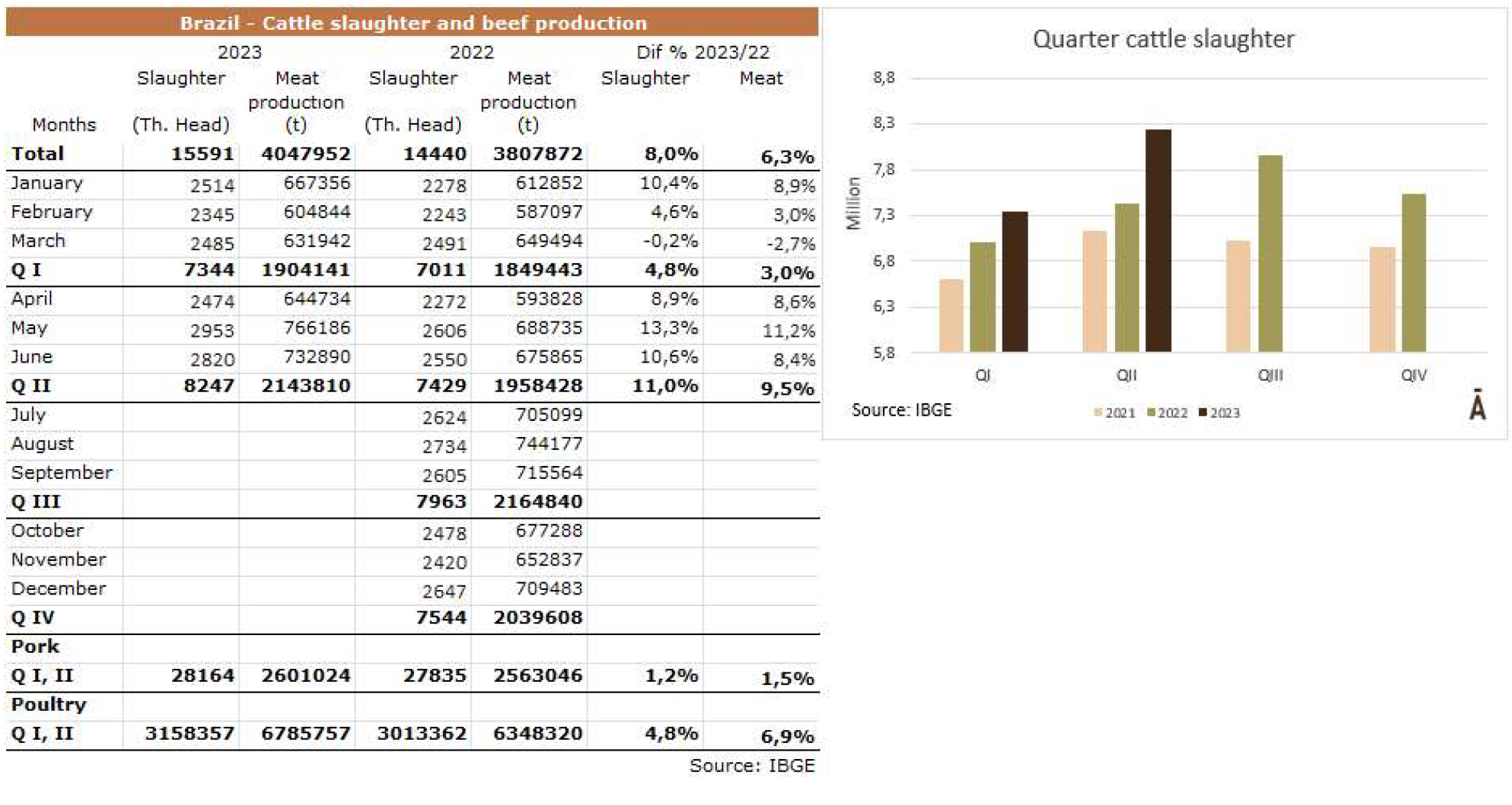 根據(jù)IBGE發(fā)布的畜牧業(yè)生產(chǎn)統(tǒng)計的初步結(jié)果,2023年第二季度,巴西有825萬頭牛在某種類型的衛(wèi)生檢查下被屠宰。與2022年第二季度相比,這一數(shù)量增長了11%,與2023年第一季度相比增長了12.3%;與前三個月相比,增加了90.3萬頭。2023年第二季度214萬噸牛肉胴體的產(chǎn)量,意味著與上年同期相比增長9.5%,與2023年第一季度相比增長12.6%。由于屠宰量的增加是由于被送往屠宰場的雌性數(shù)量增加,因此酮體的重量往往會減少。該季度平均體重為260公斤,比2022年同期減少3.7公斤。與此同時,豬肉產(chǎn)量總計130萬噸,同比下降0.3%,而家禽產(chǎn)量增加330萬噸,同比增長7.2%。