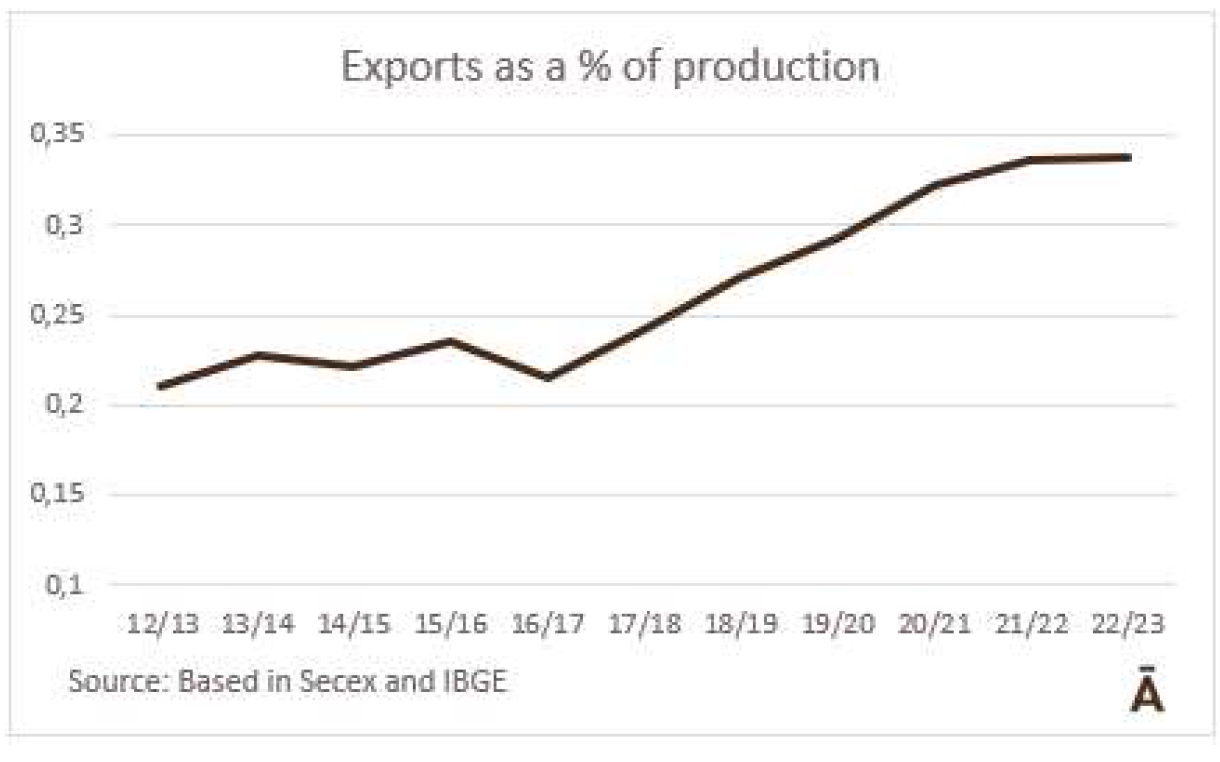 2022/23年,巴西生產(chǎn)了825萬噸牛肉胴體,與上一財年相比增長了8%(60.7萬噸)。反過來,牛肉出口總量為278萬噸胴體,按百分比計算,增幅略高于產(chǎn)量(21.6萬噸)。因此,巴西國內(nèi)牛肉消費量也增長了8%,估計為547萬噸,比2021/22年增加了39.1萬噸。巴西停止了2016/17年開始的牛肉出口比例增長趨勢。在7月1日開始的2023/24財政年度,考慮到國際需求的疲軟和屠宰牛價格的下降,出口牛肉的比例將有所下降,這對巴西人來說是可行的。在7月1日開始的2023/24財政年度,考慮到國際需求的疲軟和屠宰牛價格的下降,出口牛肉的比例將有所下降。