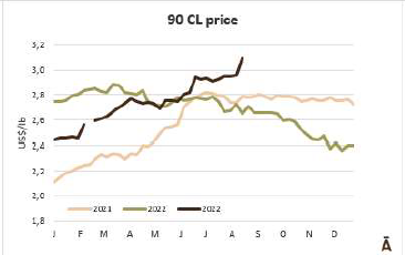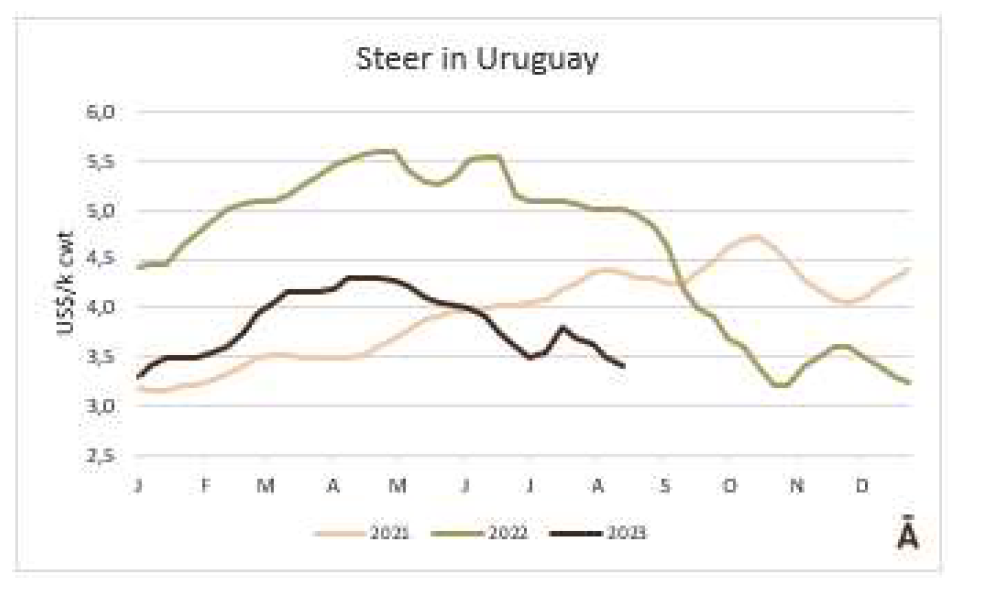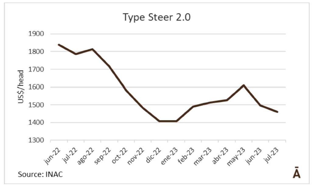 INAC 閹牛類型價值2.0在6月份跌了100美元以上后,7月份每頭又下跌36美元至1461美元。INAC閹牛類型價值預(yù)計了銷售烏拉圭特質(zhì)公牛所有產(chǎn)品中獲得的收入,并按比例考慮了在國外和當?shù)厥袌龅牟季?。由于出口和國?nèi)市場胴體價格下跌導(dǎo)致閹牛類型價值下降。另一方面,內(nèi)臟和副產(chǎn)品的價值以及生皮的價格也保持穩(wěn)定。7月份,公牛的價格下降了5.1%(61美元)至1133美元/頭。另一方面,工業(yè)增加值在月度比較中每頭回升25美元(+8.3%)。