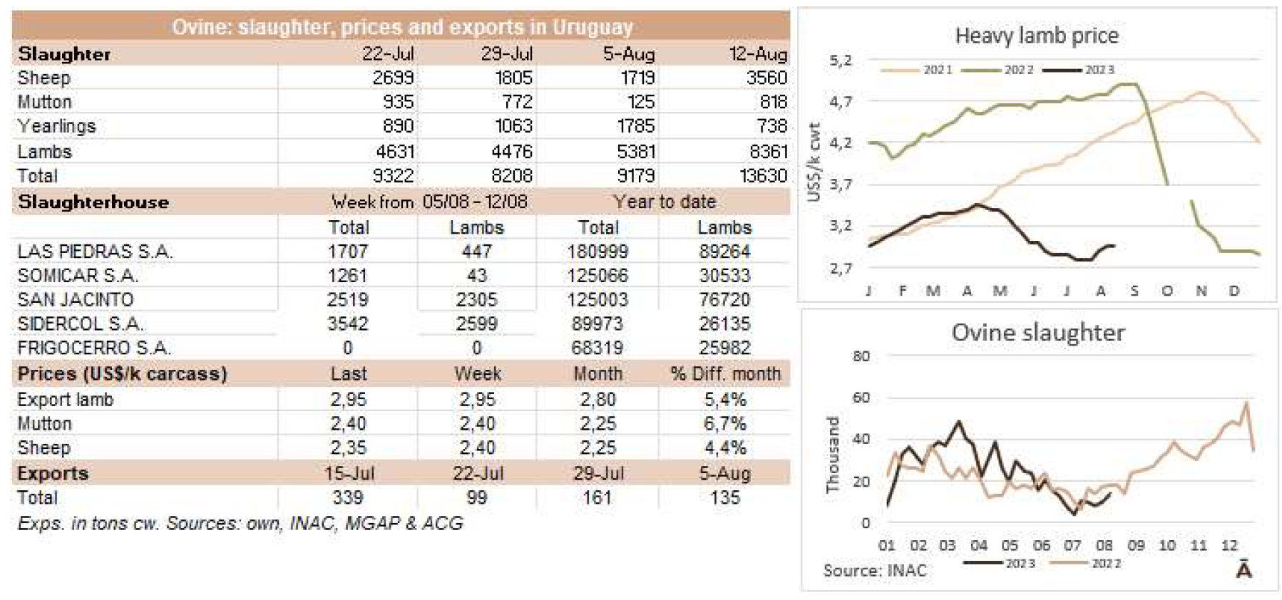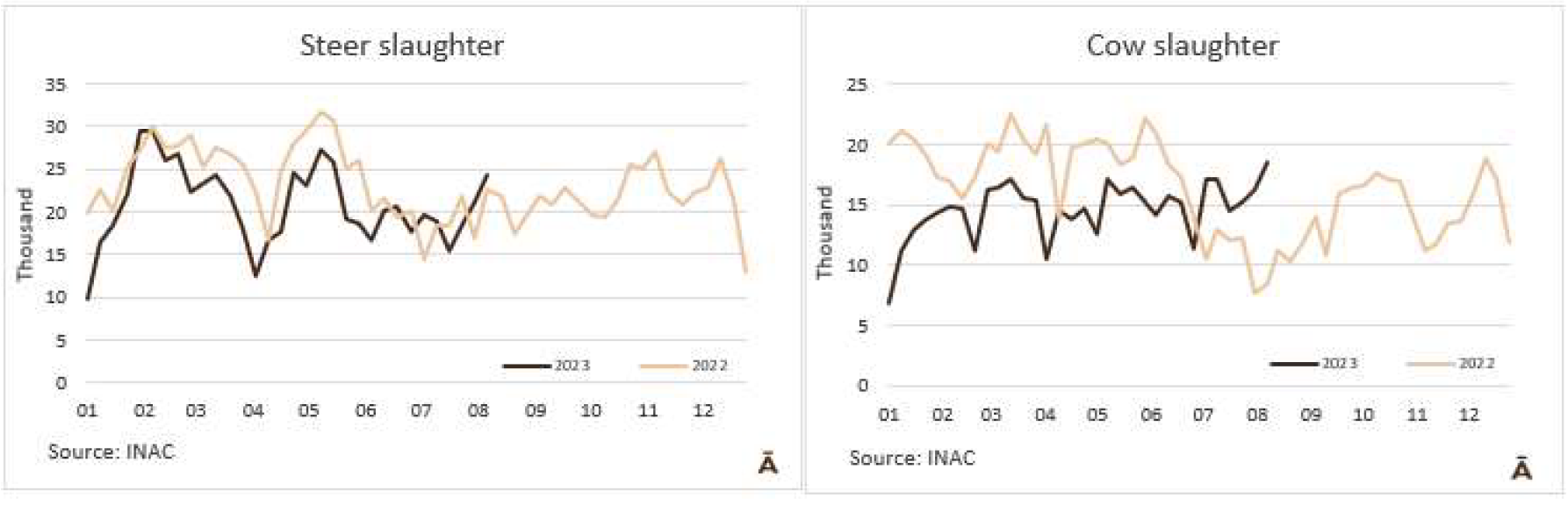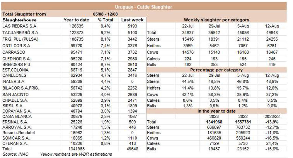 上周的牛屠宰量接近5萬頭,是自5月第二周以來數(shù)量最多的一周,當時屠宰場也在積極為481配額窗口工作。INAC報告稱,在截至8月12日的一周內(nèi),有49648頭牛進入工廠,比前一周增加了10%,比去年同期的37000頭增加了33%。屠宰量最大是Las Piedras(5193)、Marfrig-Tacuaremb6(5100)和Minerva Carrasco(3732)。擁有三個工廠的Marfrig屠宰了10927頭牛(周比較為-255頭),而同樣擁有三個工廠的Minerva屠宰了10590頭牛(周增加3552頭)。Marfrig lnaler本周再次開始恢復(fù)生產(chǎn),而Cledinor下周將進入許可期。就Minerva而言,從下周開始,它將進入卡拉斯科工廠的許可期。截至8月,共有86907頭牛被屠宰,比去年同期多36%。事實上,牛的屠宰量將連續(xù)第二個月高于2022年。