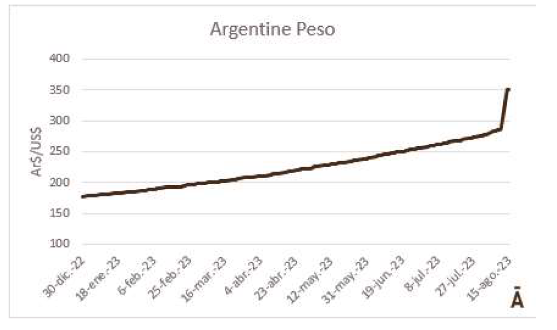 周日的選舉結(jié)果顯示,得票最多的候選人是哈維爾·米利,他是一位經(jīng)濟學家,在2021年之 前沒有政治生涯,提出了極端自由主義的建議。周日,被稱為“加密貨幣”的金融美元上漲了約10%。周一,根據(jù)國際貨幣基金組織發(fā)放資金的要求,政府將阿根廷比索貶值22%,以縮小其與自由美元之間超過100%的匯率差距。然而,隨著非官方匯率升至700比索以上,這一差距立即再次擴大。所有這些不確定性,在一個更加微妙的情況下,導(dǎo)致所有行業(yè)的銷售額普遍下降。昨天,政府與超市和食品公司召開緊急會議,試圖阻止價格上漲。