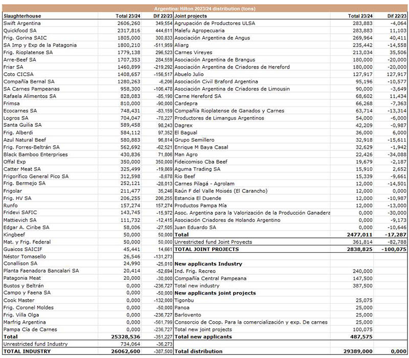 巴西公司Swift(Minerva)、Quickfood(Marfrig)和阿根廷Gorina、Imp.Y Exp.De la Patagonia(Supermercados la Anonima)和Frigorifico Rioplatense是希爾頓2023/24年配額的五大主要贏家,累計10308噸,占總數(shù)的35%。除La Anonima外,其他四家在2022/23財政年度增加了希爾頓配額范圍內(nèi)的參與度。