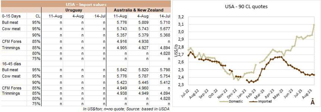 上周,美國進口市場價格沒有發(fā)生大的變化。根據(jù)一位貿(mào)易商的說法,配額范圍內(nèi)的烏拉圭90CL牛前,參考價格仍在CFR 4550美元左右。智利牛肉市場的大型零售企業(yè)正爭分奪秒地試圖淘汰9月初到期的牛肉。據(jù)消息人士透露,巴西和巴拉圭的19分體價格為CIF 5300美元至5400美元之間。另一方面這兩個供應(yīng)商第一季度的牛前價格分別為4900-5000美元。