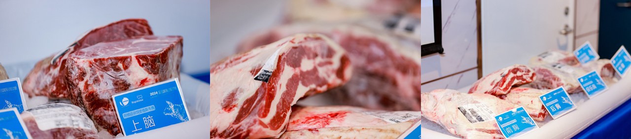 活動(dòng)現(xiàn)場(chǎng)展示阿根廷谷飼牛肉部位,包括上腦、嫩肩、眼肉、西冷、板腱、眼肉蓋、保樂肩、后胸、前胸、牛霖等。